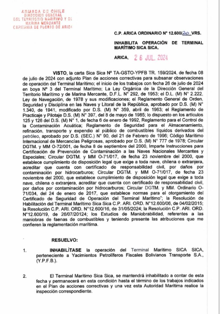 “Inhabilítase la operación del Terminal Marítima Sica Sica, perteneciente a YPFB Transporte S.A.”, disposición que está vigente desde el viernes 26 de julio, mismo que será nuevamente rehabilitado tras la inspección de la Armada chilena, parte del documento que fue publicado por el periodista John Arandia.