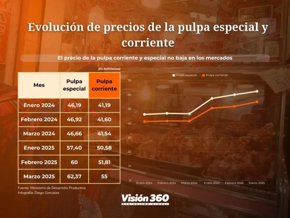 El kilo de pulpa de res se vende entre 60 y 70 bolivianos, la chuleta entre 40 y 45 y la carne molida entre 40 y 50, según Contracabol. Los trabajadores en carne marcharán el jueves.