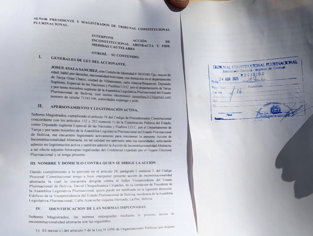 Chuquisaca, Bolivia, 24 de abril de 2025. La Confederación de Pueblos Indígenas del Oriente Boliviano (CIDOB) presentó este jueves una acción de inconstitucionalidad abstracta ante el Tribunal Constitucional Plurinacional (TCP) en Sucre. El recurso cuestiona los artículos 5 y 15 de la Ley 1096, al considerar que restringen el derecho de participación política de los pueblos indígenas en las elecciones nacionales.