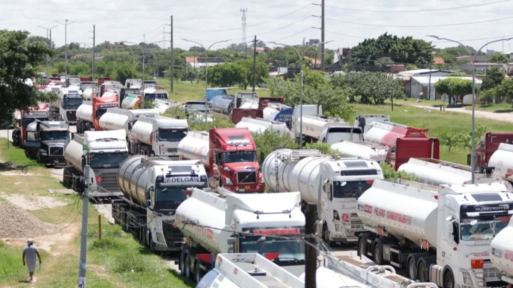 El sol cae a plomo sobre el asfalto y no hay bocinazos ni motores encendidos. Solo filas. Filas largas, densas, interminables. Decenas de camiones cisternas permanecen detenidos en los accesos a la refinería de Palmasola, formando un corredor metálico de tanques blancos, rojos y plateados cargados con combustible que aún no puede descargarse. El escenario es caótico.