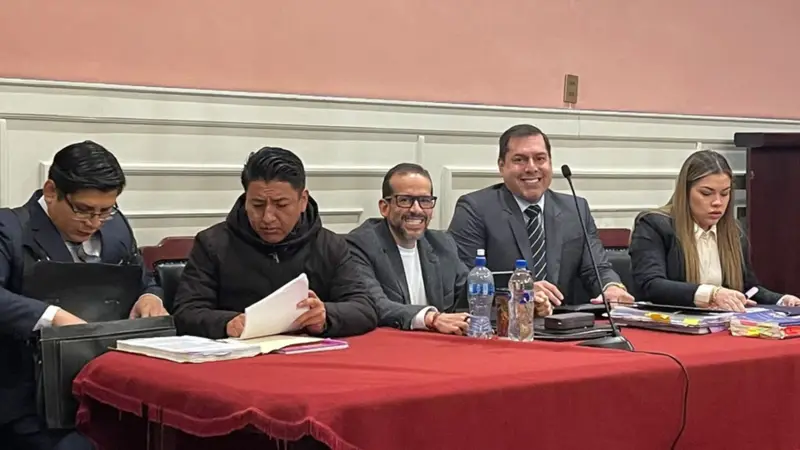 La Paz, Bolivia, 25 de agosto de 2025. La audiencia de revisión de plazos de detención preventiva del gobernador de Santa Cruz Luis Fernando Camacho y el exlíder cívico de Potosí Marco Pumari comenzó este lunes a las 14.15 luego de que las autoridades arribaran en la ciudad al mediodía.