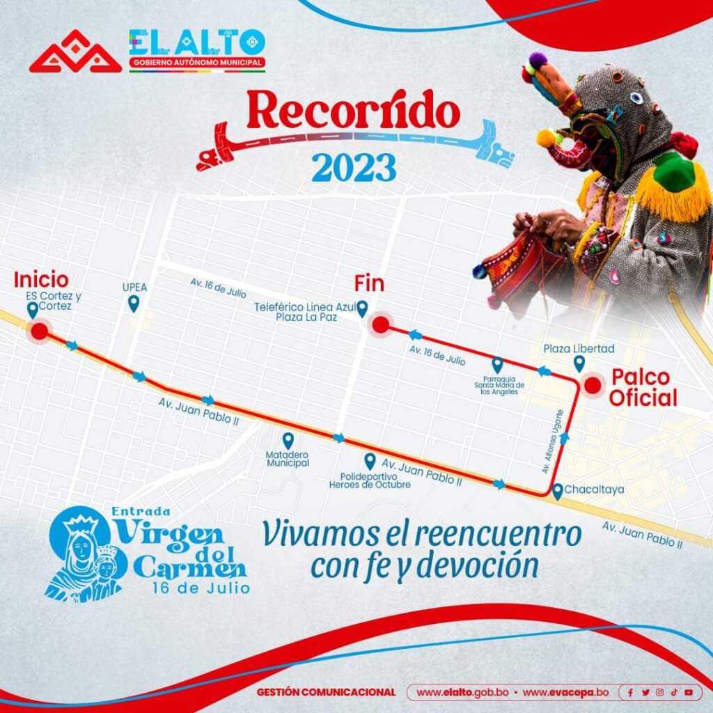 Para esta gestión se espera la participación de 60 fraternidades. El recorrido empezará en la avenida Juan Pablo II y terminará en inmediaciones de la estación de la Línea Plateada de Mi Teleférico. El palco estará instalado en la plaza Libertad.