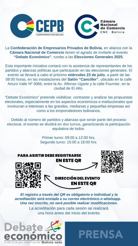 La Paz, 22 de julio de 2025.– La Confederación de Empresarios Privados de Bolivia (CEPB) y la Cámara Nacional de Comercio (CNC Bolivia) se complacen en invitar al evento «Debate Económico», en el marco de las Elecciones Generales 2025.