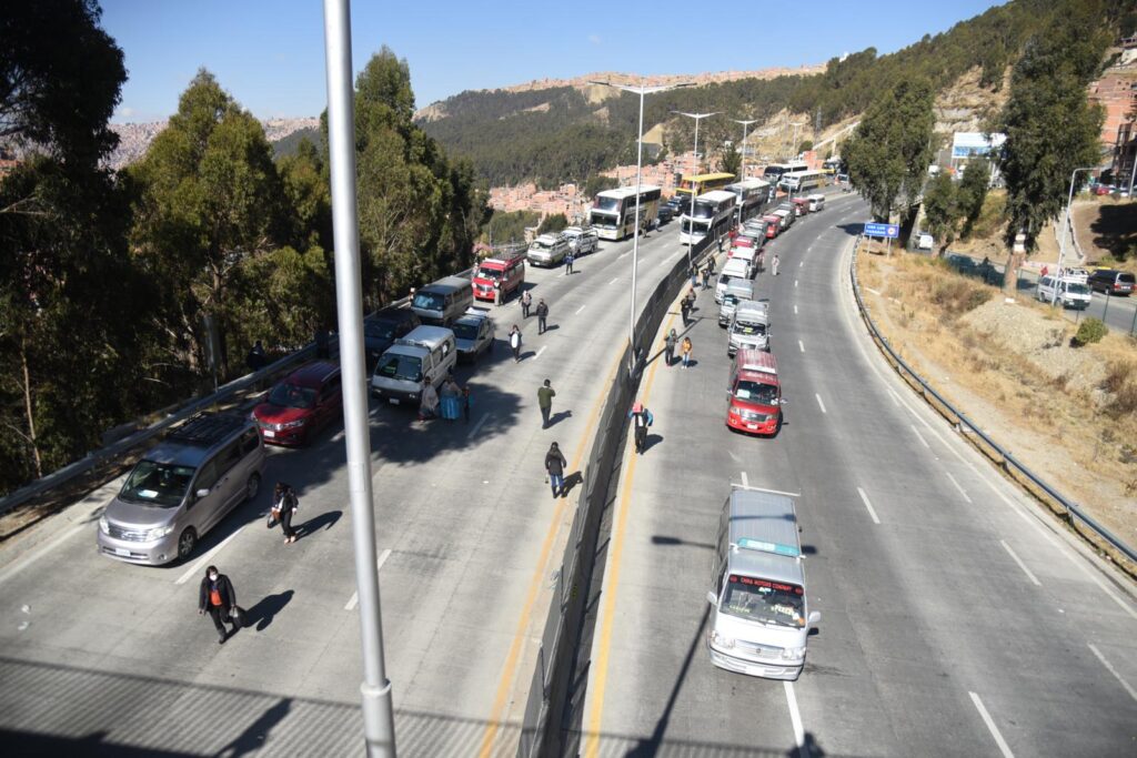 La Policía coadyuva en el redireccionamiento de los motorizados. Esta vía es estratégica, pues al unir a las ciudades de La Paz y El Alto implica un movimiento de centenares de motorizados cada jornada.