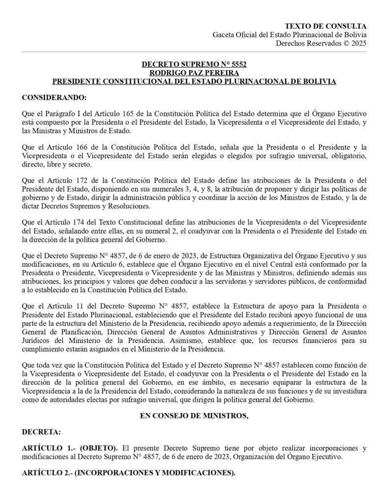 El presidente Rodrigo Paz promulgó el Decreto Supremo N° 5552, una norma que reestructura de manera sustancial la Vicepresidencia del Estado y limita su campo de acción a funciones principalmente legislativas.