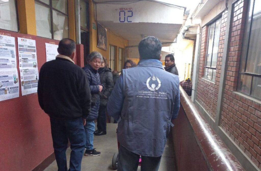 La Paz, Bolivia, 17 de agosto de 2025. La Defensoría del Pueblo presentó este domingo un balance preliminar de su monitoreo electoral y afirmó que el 85% de los recintos del país desarrolló la jornada de votación en un ambiente pacífico y transparente.