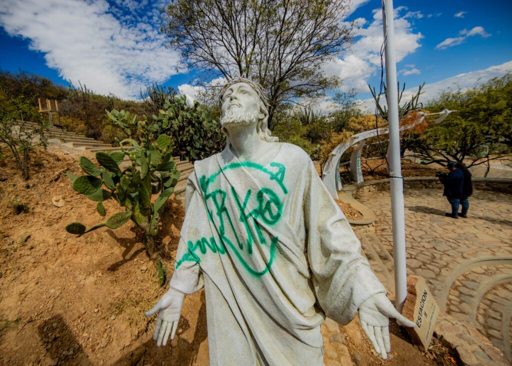Cochabamba, Bolivia, 25 de agosto de 2025. El director de Medio Ambiente, Elvis Gutiérrez, denunció la vandalización de 10 estaciones del Vía Crucis ubicadas en el Cerro San Pedro y anunció que se inició una investigación para dar con los responsables.