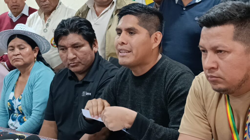 Cochabamba, Bolivia, 18 de agosto de 2025. El dirigente de la Coordinadora del Trópico de Cochabamba, Aquilardo Caricarí, pidió al Tribunal Supremo Electoral (TSE) retirar las licencias de funcionamiento a las empresas encuestadoras que difundieron estudios de intención de voto antes de los comicios generales del 17 de agosto.