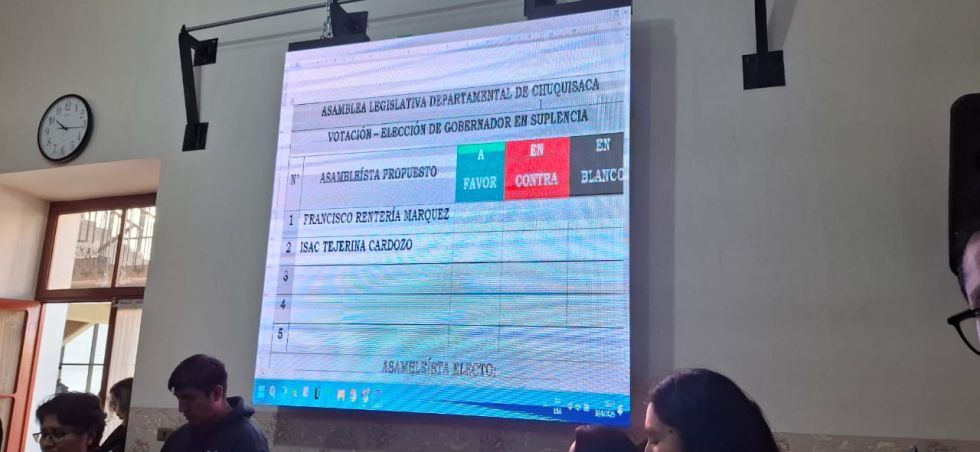 La sesión se reanudó pasadas las 10:00 de este lunes, tras el receso decretado el pasado viernes. Se propusieron dos nombres para ocupar el cargo interino: Isac Tejerina, por la agrupación Chuquisaca Somos Todos (CST), y Francisco Rentería, por el Movimiento Al Socialismo (MAS).