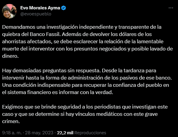 Además, Morales señaló que hay varias interrogantes que deben ser aclaradas en torno a lo que está pasando con el ex Banco Fassil.