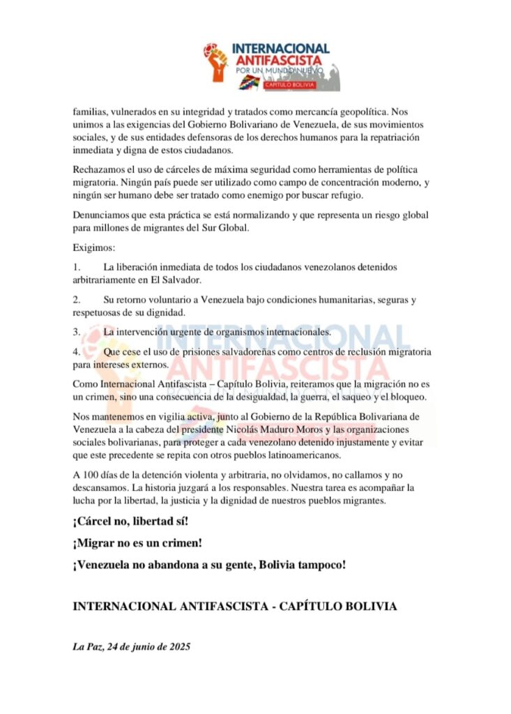 La Paz, Bolivia, 24 de junio de 2025. Este martes 24 de junio se cumplen 100 días desde la detención de un grupo de migrantes venezolanos en una prisión de máxima seguridad en El Salvador. La Internacional Antifascista – Capítulo Bolivia denunció el hecho como una violación sistemática a los derechos humanos y exigió su liberación inmediata.
