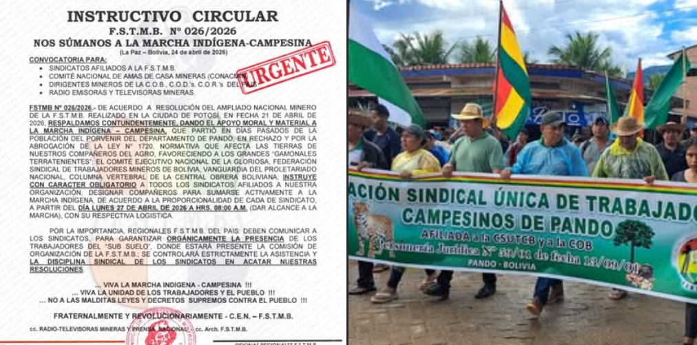 La Federación Sindical de Trabajadores Mineros de Bolivia (FSTMB) instruyó a sus bases a incorporarse, desde este lunes, a la marcha indígena campesina que partió desde Porvenir, en el departamento de Pando, en rechazo a la Ley 1720. La determinación está contenida en la resolución N° 026/2026, aprobada en el ampliado nacional minero realizado en Potosí el 21 de abril.