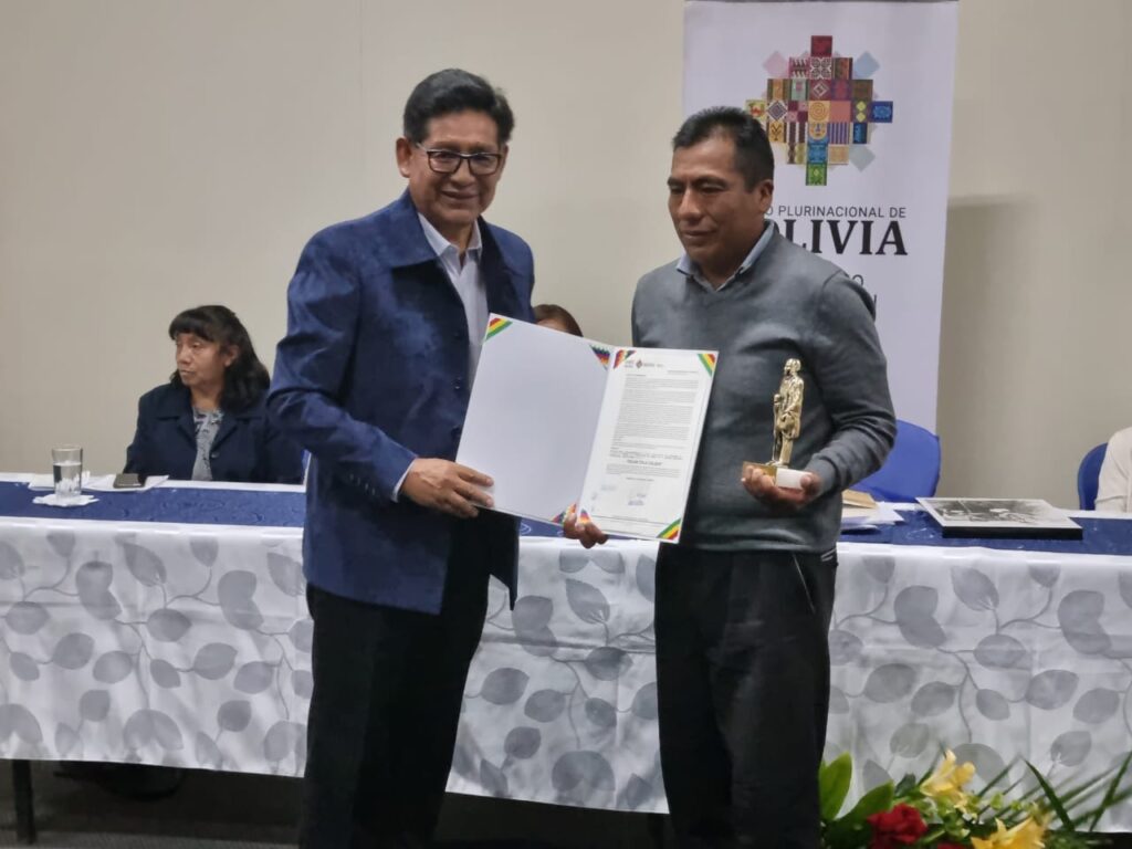 El ministro de Educación, Edgar Pary Chambi, entregó reconocimientos y estatuillas “Avelino Siñani” a diez maestras y maestros que produjeron libros en tres categorías: Investigaciones Individuales Publicadas, Textos de Aprendizaje y Producción Literaria Individual. Los galardones fueron entregados durante el acto de presentación del libro “Warisata, La Escuela – Ayllu”, desarrollado hoy en la Feria Internacional del Libro de La Paz.
