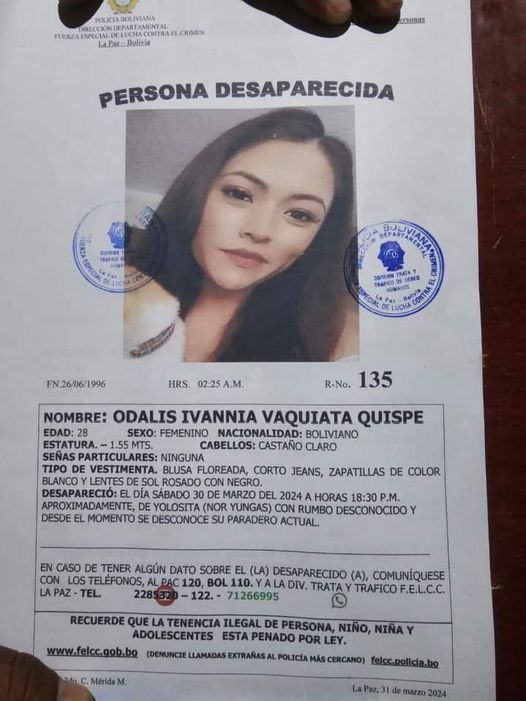 Odalis Vaquiata Quispe está desaparecida desde las 18.30 del sábado. La joven y su enamorado emprendieron viaje hacia los Yungas de La Paz y, luego de una discusión, desapareció y hasta el momento se desconoce su paradero.