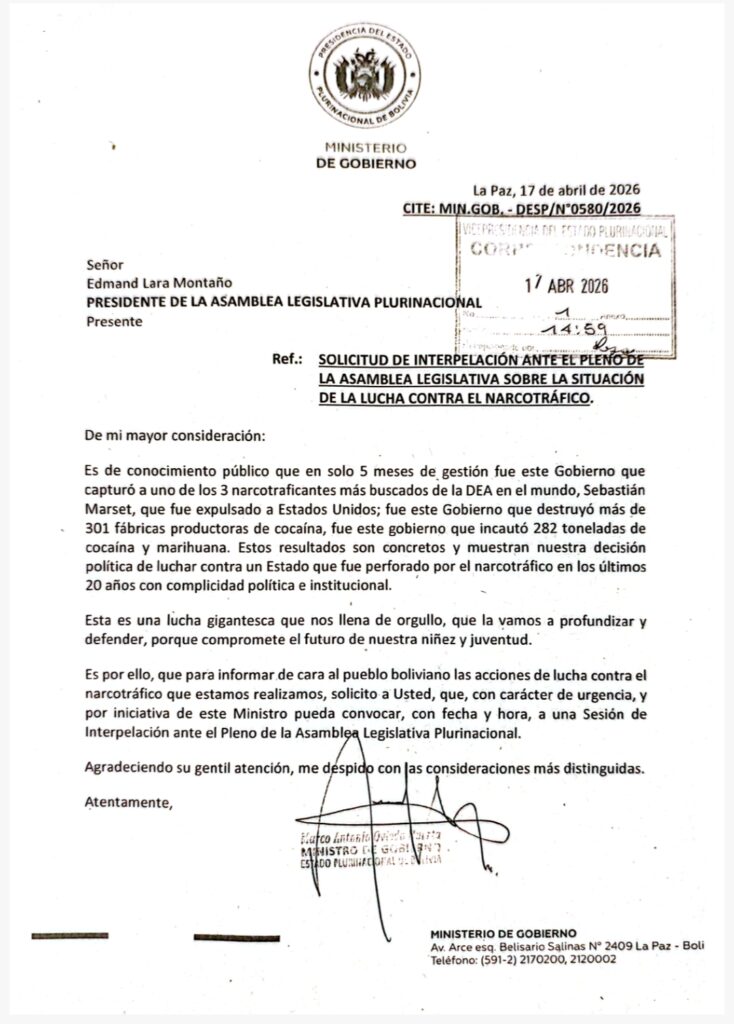 La Paz, 17 de abril de 2026.- El ministro de Gobierno, Marco Antonio Oviedo, remitió una nota oficial al presidente de la Asamblea Legislativa Plurinacional (ALP), Edman Lara Montaño, solicitando que se fije “con carácter de urgencia” día y hora para su interpelación ante el pleno, con el fin de informar sobre la política estatal y los resultados en la lucha contra el narcotráfico.