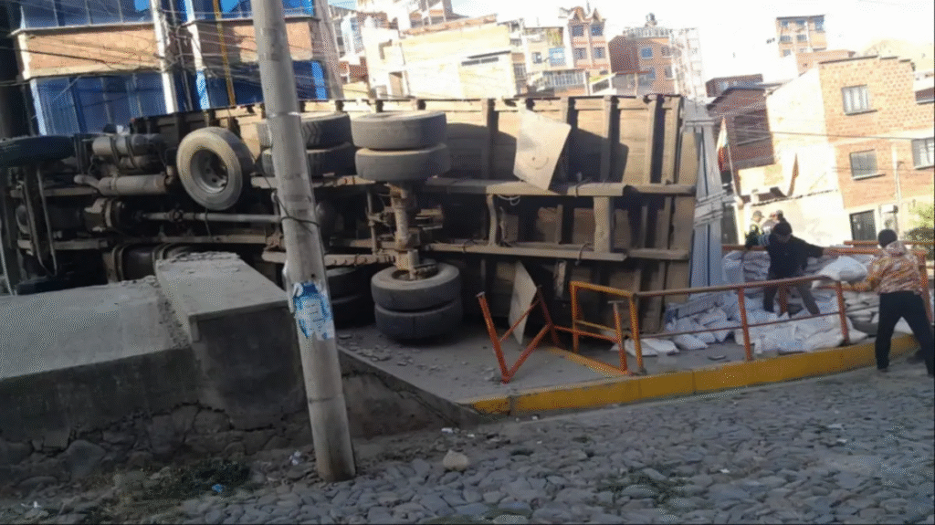 La Paz, Bolivia, 12 de agosto de 2025. Chofer que se dirigía a Cochabamba con un camión cargado de arroz terminó volcado esta tarde en su primer viaje, debido que no conocía la ruta y el mal de estado de algunas vías de transporte.