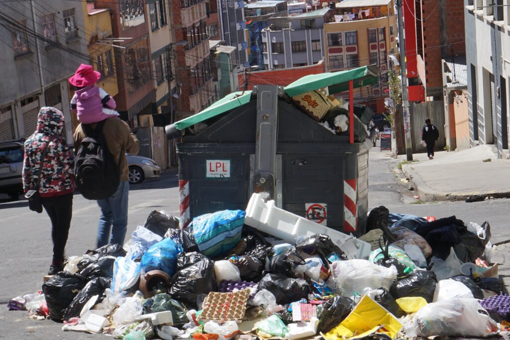 La Paz, Bolivia, 11 de agosto de 2025. Entre la calle Colón y Mercado, se mantiene el bloqueo este lunes por la tarde, pues las esposas de trabajadores del relleno sanitario Sak’a Churu, en Alpacoma rechazan que la empresa Colima asuma el servicio de limpieza.