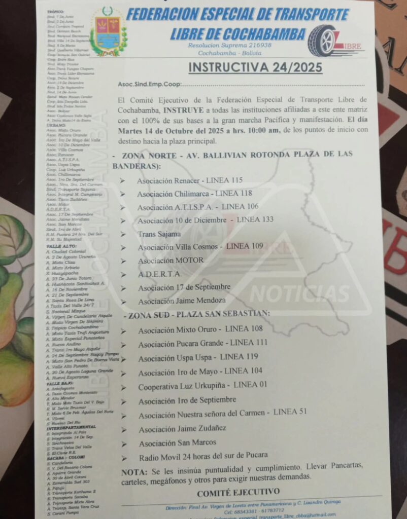 En un instructivo emitido por su Comité Ejecutivo, el Transporte Libre ordenó a todas sus bases acatar una movilización con marchas y bloqueos en el trópico, el valle alto y las principales vías interdepartamentales. “Se instruye la participación del 100% de nuestras instituciones afiliadas en la gran marcha pacífica y manifestación”, señala el documento.