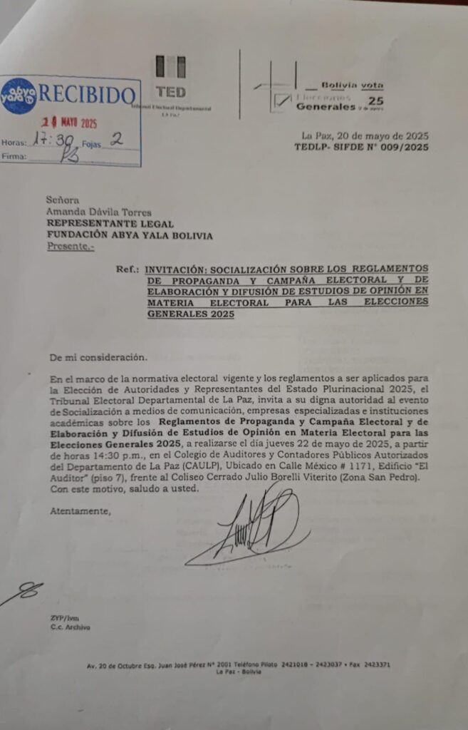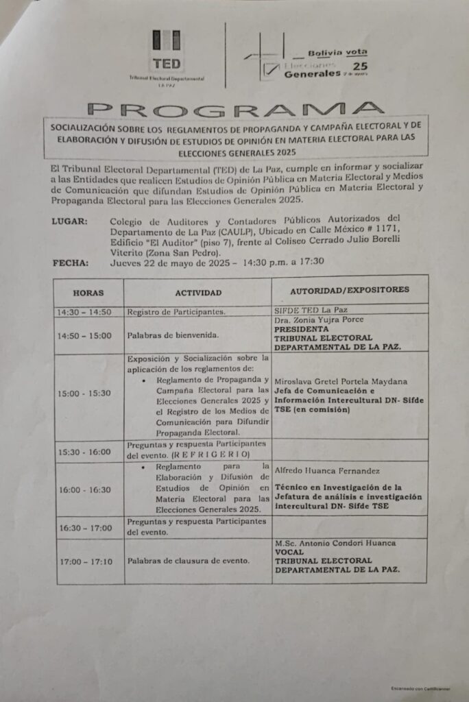 La Paz, 22 de mayo de 2025 – El Tribunal Electoral Departamental (TED) de La Paz socializó los reglamentos de Propaganda y Campaña Electoral y de Elaboración y Difusión de Estudios de Opinión en Materia Electoral con medios de comunicación, empresas especializadas e instituciones académicas. El evento se realizó en el marco de las Elecciones Generales de 17 de agosto 2025.
