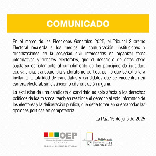 La Paz, 15 de julio de 2025 – El Tribunal Supremo Electoral (TSE) emitió un comunicado recordando a los medios de comunicación, instituciones y organizaciones de la sociedad civil interesadas en organizar foros informativos y debates electorales que deben sujetarse estrictamente a los principios de igualdad, equivalencia, transparencia y pluralismo político.