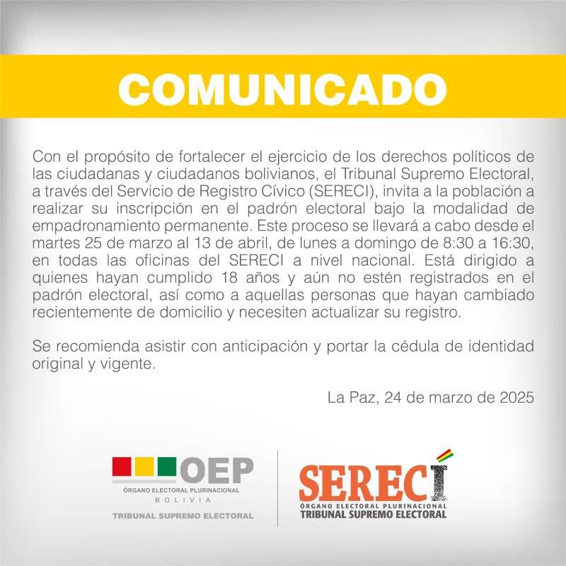 La Paz, Bolivia, 25 de marzo de 2025. El Tribunal Supremo Electoral (TSE), a través del Servicio de Registro Cívico (SERECI), inició el proceso de empadronamiento permanente para ciudadanos que aún no están registrados en el padrón electoral y para quienes necesiten actualizar su domicilio.