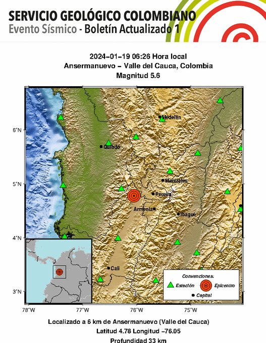 El Servicio Geológico Colombiano informó este viernes sobre un sismo con epicentro en el municipio de Ansermanuevo, en el departamento del Valle del Cauca. El foco del movimiento telúrico, de magnitud 5,6, se localizó a 33 kilómetros de profundidad