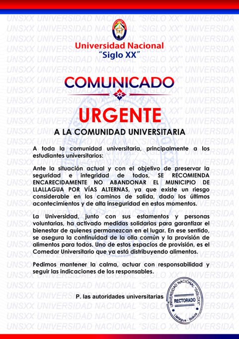Llallagua, 12 de junio de 2025 – La Universidad Nacional «Siglo XX» ha emitido un comunicado urgente a toda la comunidad universitaria, especialmente a los estudiantes, recomendando «enfáticamente no abandonar el municipio de Llallagua por vías alternas». La decisión se basa en el riesgo considerable en los caminos de salida, debido a los «últimos acontecimientos y de alta inseguridad en estos momentos».